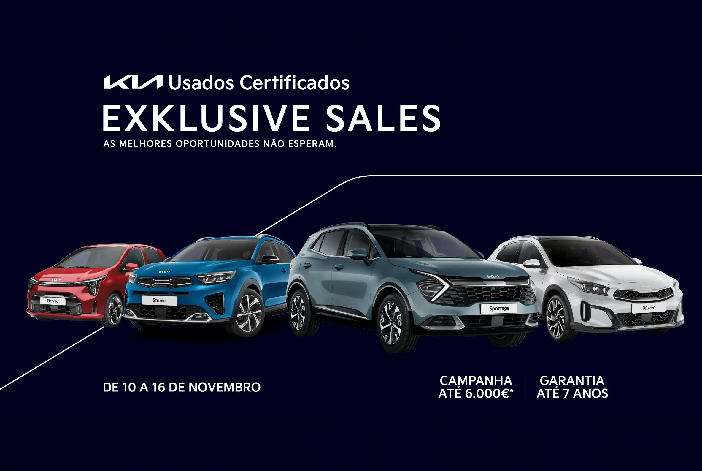 De 10 a 16 de novembro, as melhores oportunidades não esperam, com condições únicas em vários modelos da gama. Este é o momento ideal para conduzir o Kia dos seus sonhos com vantagens que fazem a diferença: