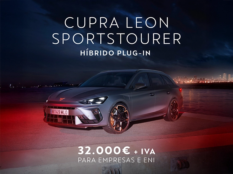 *Campanha válida para Empresas e ENI – negócios fechados – até 30/04/2026 e limitada ao stock existente. Valor para CUPRA Leon Sportstourer 1.5 e-Hybrid DSG 204cv. Consumo combustível combinado WLTP (l/100km):1,3 – 1,5. Consumo elétrico combinado WLTP (kWh/100km): 13,0 – 13,4. Emissões CO2 WLTP (g/km): 29 – 34. Imagem não contratual.