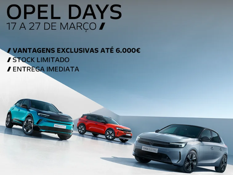 Chegam os Opel Days, um período especial com condições exclusivas na gama Opel. Durante apenas alguns dias, pode aproveitar vantagens até 6.000€ em viaturas selecionadas.