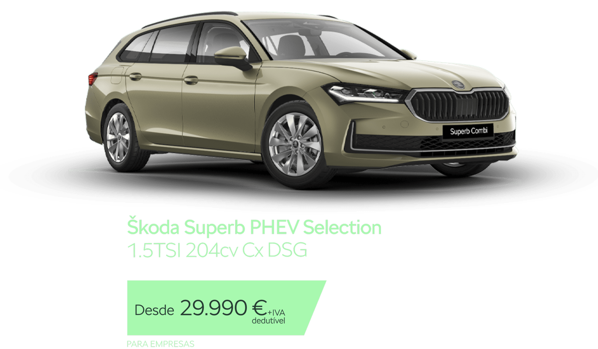 *Preço válido com financiamento, no Continente. Valor recomendado para Empresas para a versão Superb Break PHEV Selection 1.5TSI 204cv DSG. Inclui desconto promocional, pintura metalizada, despesas de legalização e ISV. Valores apresentados em vigor até 30.06.2026. Emissões de CO₂ de 28 g/km. Consumo de combustível de 1,2 l/100km. Consumo combinado de 12,9 kWh/100km. Autonomia elétrica (combinada) de 137 km. Valores WLTP. Imagem meramente ilustrativa.